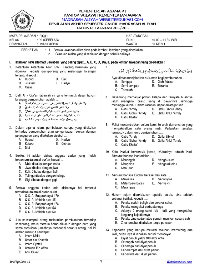 Fiqh, sebagai salah satu cabang ilmu dalam Islam, memiliki peran sentral dalam membimbing umat manusia untuk menjalani kehidupan sesuai syariat. Mempelajari Fiqh bukan hanya sekadar menghafal hukum, melainkan memahami filosofi, hikmah, dan aplikasi praktisnya dalam setiap aspek kehidupan. Bagi siswa kelas 11, semester 2 adalah momen krusial untuk mendalami materi Fiqh yang lebih kompleks, khususnya terkait dengan muamalah (transaksi), jinayah (pidana), dan miras (waris). Evaluasi dalam bentuk 30 soal pilihan ganda seringkali menjadi cerminan seberapa jauh pemahaman siswa terhadap materi-materi tersebut. Artikel ini akan mengupas tuntas lingkup materi, karakteristik soal, serta strategi untuk menguasai Fiqh kelas 11 semester 2.