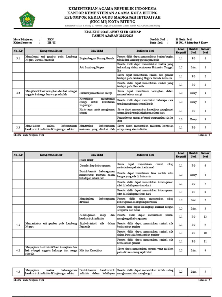 Memahami kisi-kisi soal ujian PKn kelas 3 SD semester 1 menjadi kunci penting bagi guru untuk merancang pembelajaran yang efektif dan bagi orang tua untuk mendampingi anak-anak mereka dalam belajar. Kisi-kisi ini tidak hanya sekadar daftar topik, melainkan peta jalan yang mengarahkan fokus pembelajaran dan penilaian. Artikel ini akan mengupas tuntas kisi-kisi soal PKn kelas 3 SD semester 1 Kurikulum 2013, membahas kompetensi inti, kompetensi dasar, indikator pencapaian kompetensi, hingga contoh-contoh tipe soal yang mungkin dihadapi siswa.
