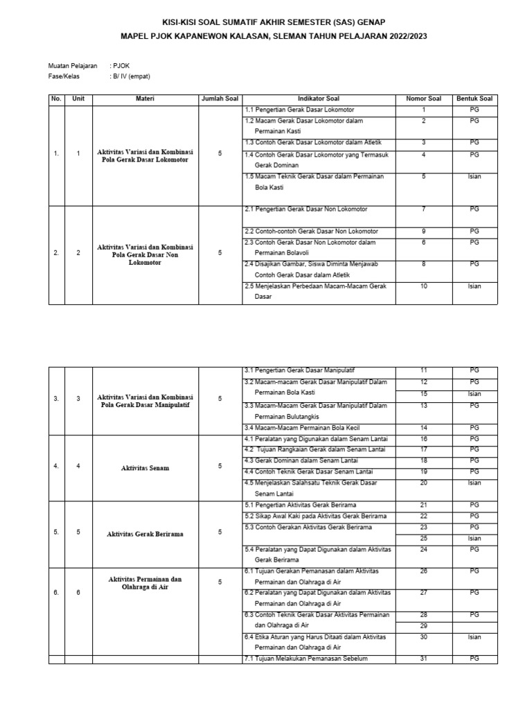 Kisi-kisi soal merupakan instrumen penting dalam penyusunan soal ujian yang valid dan reliabel. Untuk KD 3.1 PJOK Kelas 4, kisi-kisi biasanya memuat beberapa komponen kunci: